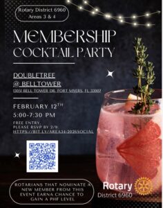 All Events This event has passed. Rotary District 6960 Membership Cocktail Party February 12 @ 5:00 pm - 7:30 pm Add to calendar Google Calendar iCalendar Outlook 365 Outlook Live Details Date: February 12 Time: 5:00 pm - 7:30 pm Event Category:Special Event Event Tags:Events Venue Doubletree @ Belltower 13051 Bell Tower Drive Fort Myers, FL 33907 United States + Google Map